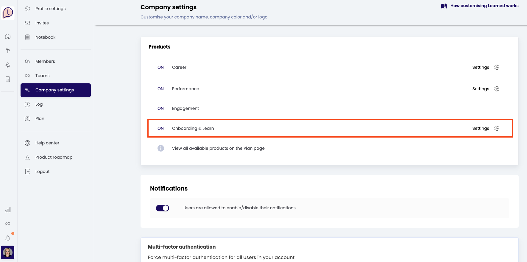 You can do this by going to Profile photo (bottom left) - Company settings - Products - Onboard & Learn - Settings.
