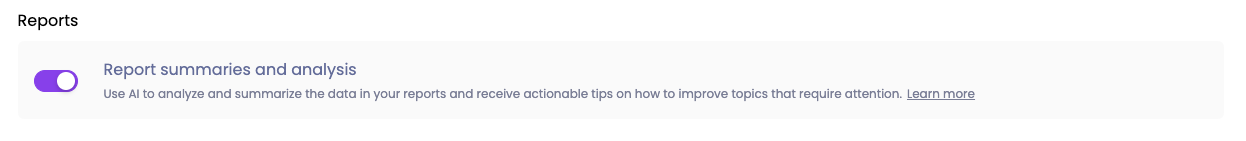 In the Reports section you can decide if you want to use AI to summarize and analyze the data in your reports and receive actionable tips on how to improve topics that require attention.