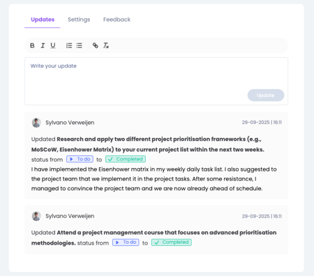 When you update a goal or an activity of a goal in Learned, for example by adding a comment, the system will analyze the content of the comment, the activity, and the status provided to create a possible insight for the owner of the goal and his/her coach.