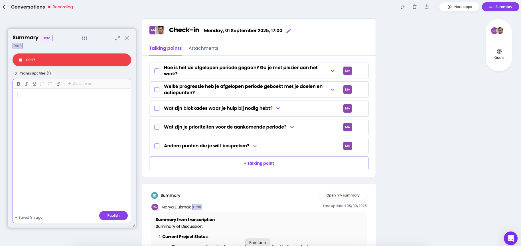 When conducting a personal 1-1 meeting, there are several ways to record the conversation. You can write notes manually in the “Summary” section or have the conversation automatically recorded and summarized by AI. Afterward, ensure that the summary is published. Only published summaries can be processed into insight suggestions.