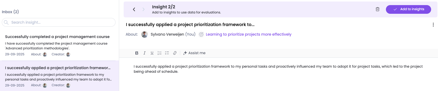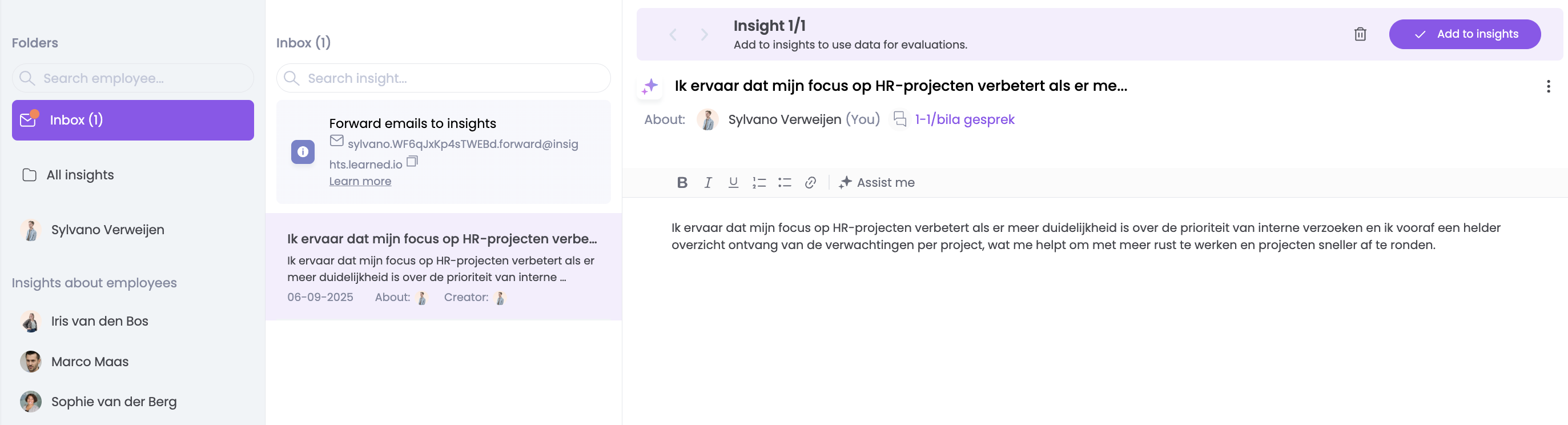 All insight suggestions are generated every night and can be found in the ‘Insights inbox’. You can recognize these suggestions by their source: “1-1 conversation” or “Name of the goal.” You can always click on the source to navigate to the relevant source.