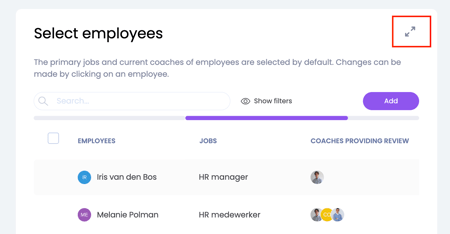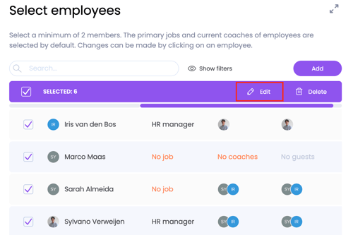 If you want to make changes to this, you can make changes per employee at step 2. To do this, click on the employee and a pop-up will appear. This allows you to adjust the jobs for evaluation and distinguish between the coaches who have to provide input (the review coaches) and which coaches are present at the conversation (guests).