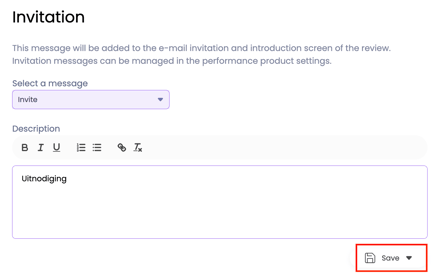 In addition to being able to create different invitation messages in advance in the Performance product settings, you also have the option to customize when creating the evaluation round and message. You can have the modified message overwrite the old message or save it as a new message.