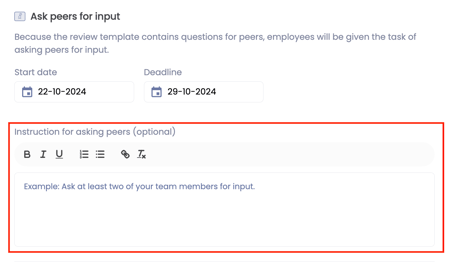 💡 If 360 degree feedback is turned on for the review, as Admin you can write an instruction for inviting the peers. For example, that there is a maximum or that they can only invite peers from their own department.