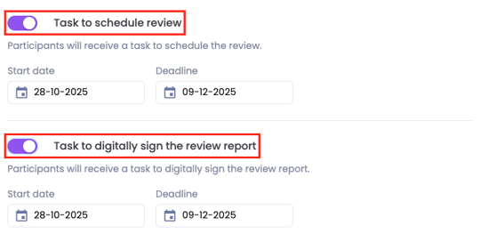 ❗️Note: You can only set a start and end date for scheduling and digitally signing a review if this has been enabled in step 3, ‘General settings’, when creating the review cycle.