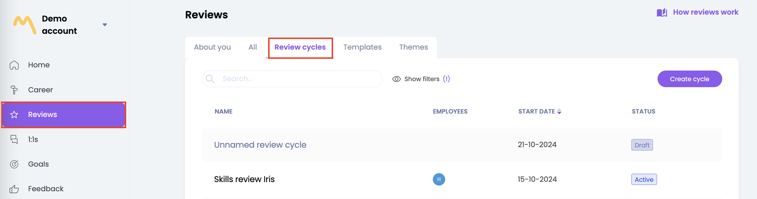 This page shows an overview of all review cycles that have been created. You can filter here by active or archived cycles, by clicking on 'Show filters'. Using the 'Create Cycle' button you can create a new evaluation cycle.