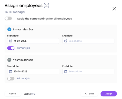 💡The selected start and end date will determine wether this is the active, previous or future job for the employee. This will reflect on the status of the job per person.