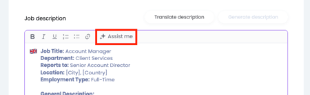 The ‘Assist me’ button quickly helps you when you need support when writing or editing texts. Click the button to receive smart AI suggestions. Whether you want to improve a description, translate the text, make it longer or shorter, or check its grammar.