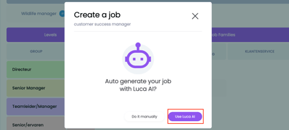 💡 When you are going to add a new job that is not already in the Learned job database, you have the option of using Luca AI. If you use Luca AI, the job profile, including job description and associated KPIs and competencies will be generated using AI.