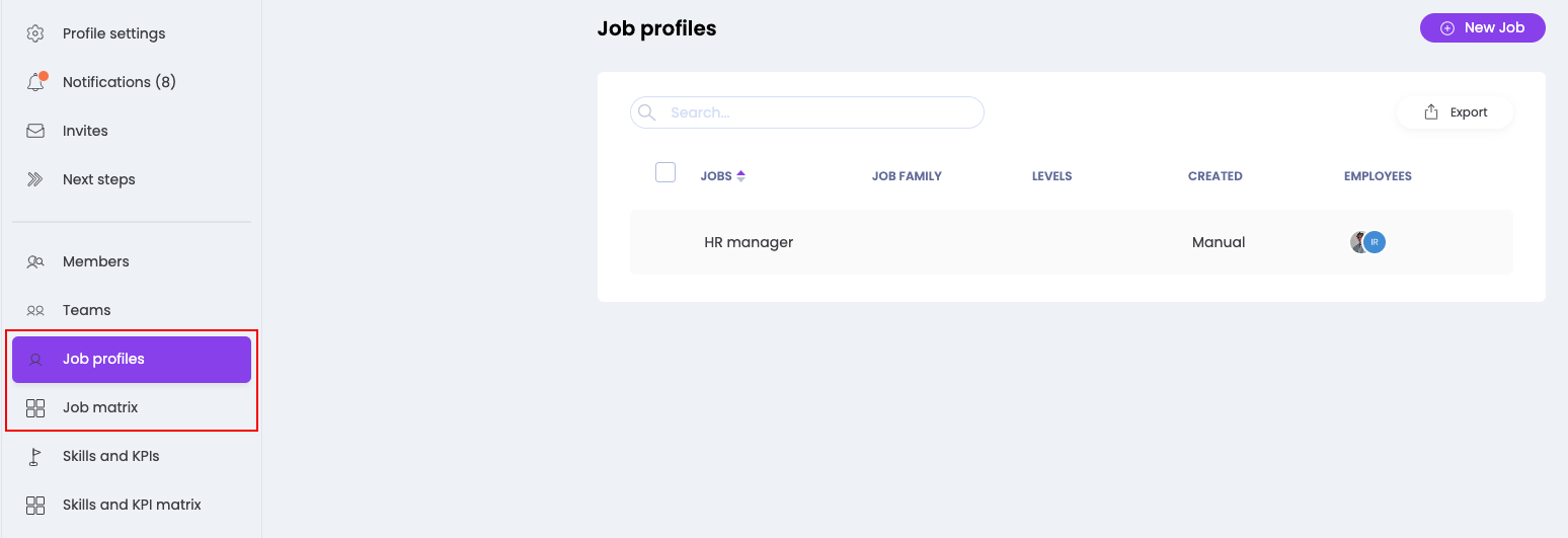 You can find the added job profiles via your profile picture (bottom left in the menu) in the submenu 'Job profiles' or 'Job matrix':