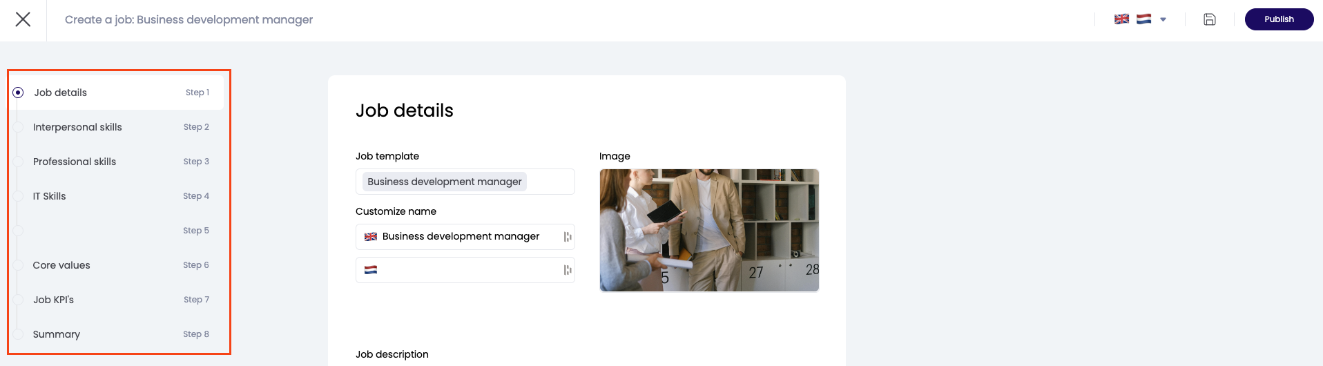 If you have chosen one of the Learned job templates, you will see that in step 1 you only need to fill in the job name multilingual. An image matching the job is already selected and the job description (multilingual) is already added.