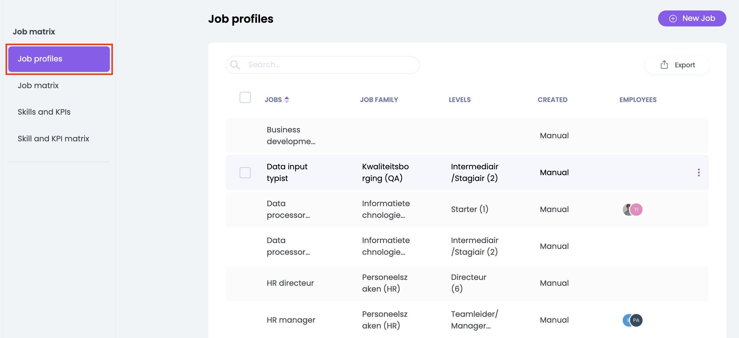 If you go to your profile picture - Job Profiles, you will get an overview of all the job profiles you have added to Learned. Here you see the name of the profile, which job family and level it is linked to, and which employees are linked to this job.