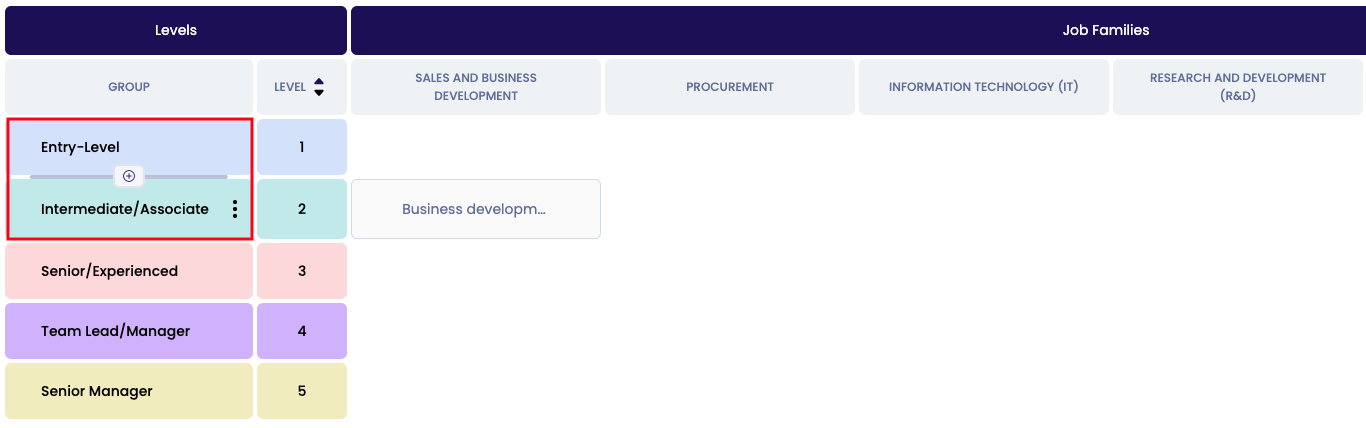 ❗️Note: You can add extra levels to a job group by hovering between two levels and click on the + sign, or delete the extra level. At any time there should always be 1 level linked to a job group. Renaming the levels is not an option.