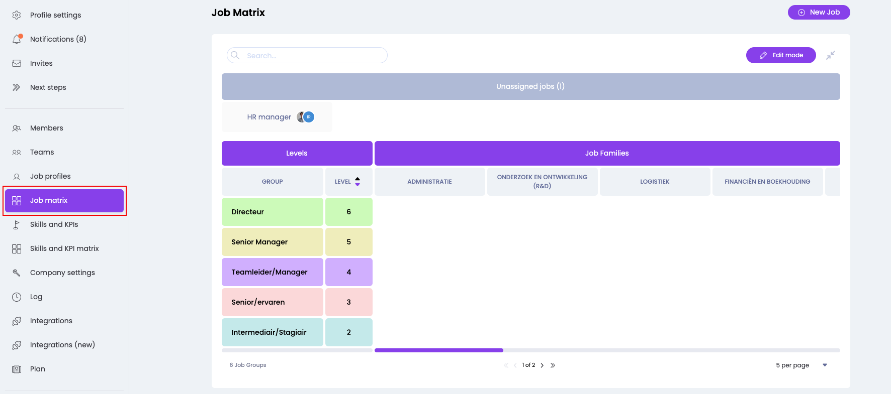 When you add job profiles to Learned, you have the option to place all these profiles in the job matrix. If any job profiles are not yet placed in the job matrix, you will see them as “Unassigned Jobs. When you want to assign these profiles to the correct job family and job group, you can do so by clicking the 'Edit' button in the job matrix.
