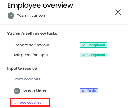 On the overview page, click on the employee to which the coach should be added. Then choose 'add coaches', and add the desired coach to the review at this employee.