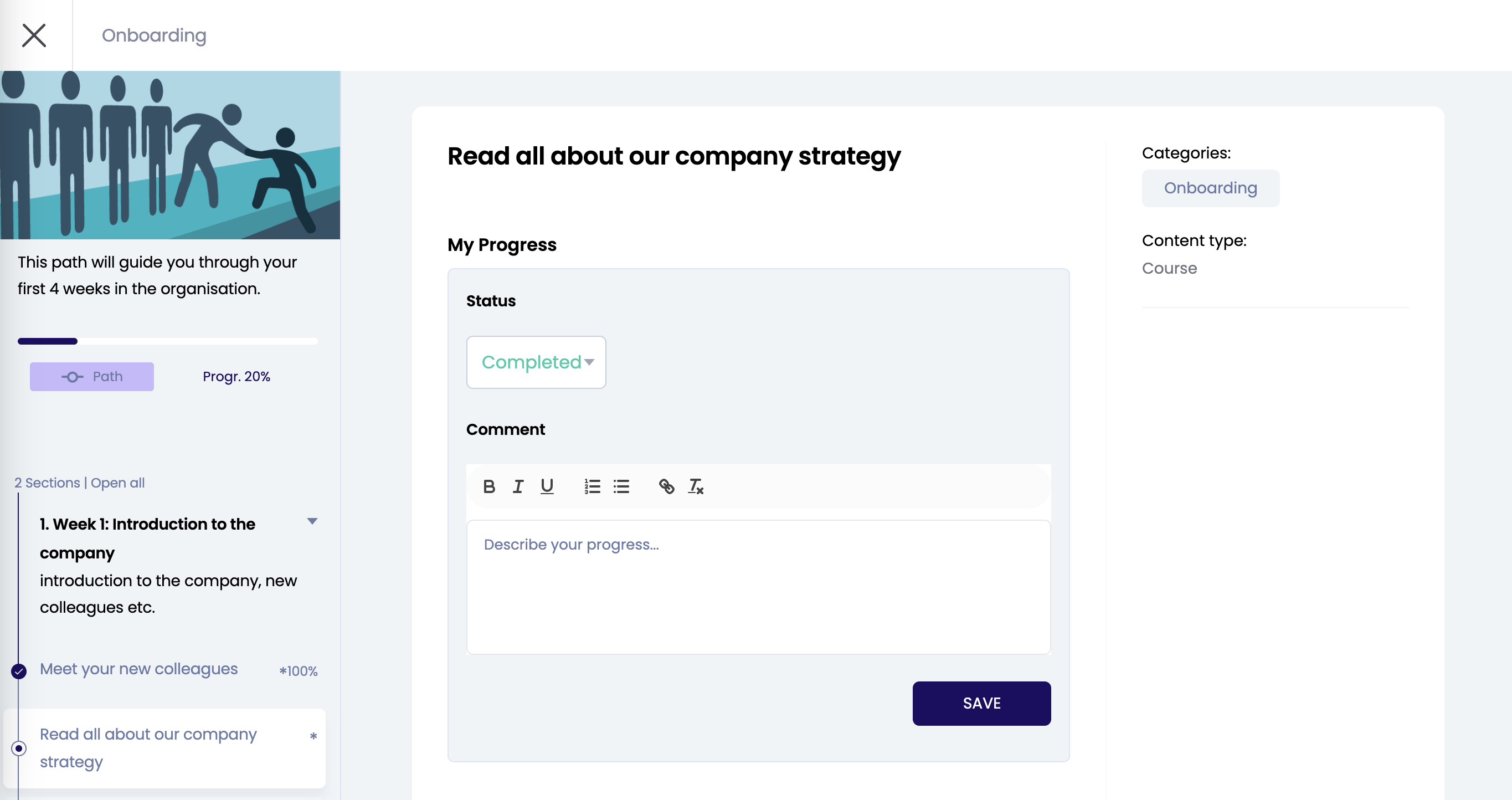 The learning resources are, for example, courses, videos or articles that you must follow. Click on a learning resource on the left and update your status to keep track of the progress of this activity. When completing all activities your progress bar of the learning path will automatically be at 100%.