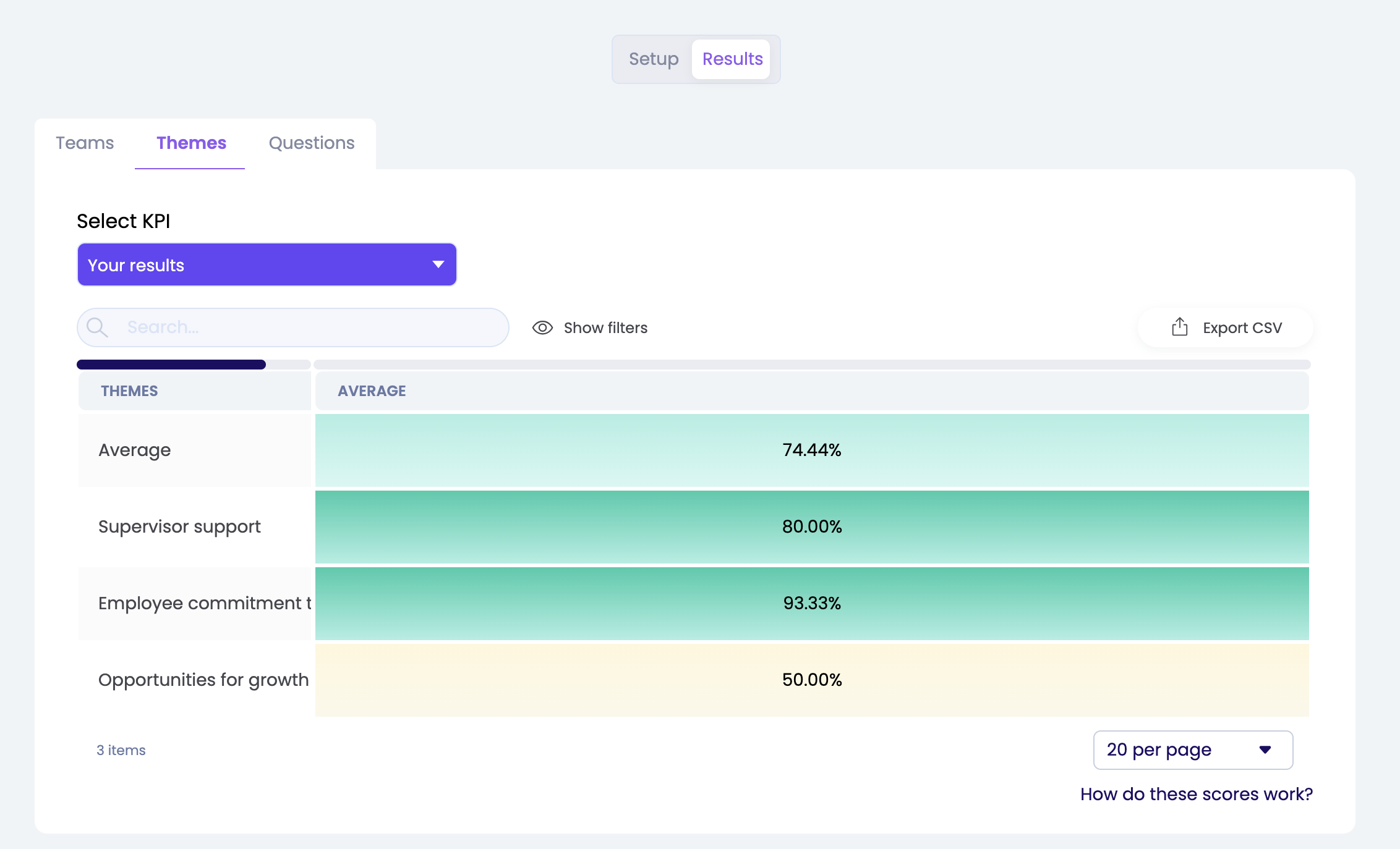 Under the 'Results' tab, you can see your answers with a score per theme. You can also see the organisation's results per theme. So you can see how you score per theme compared to the organisation.