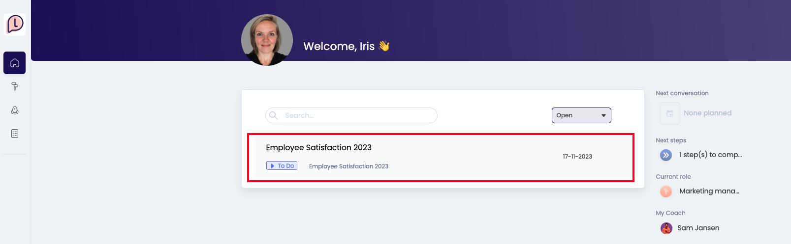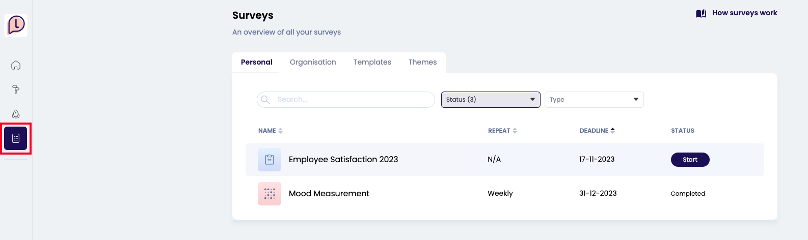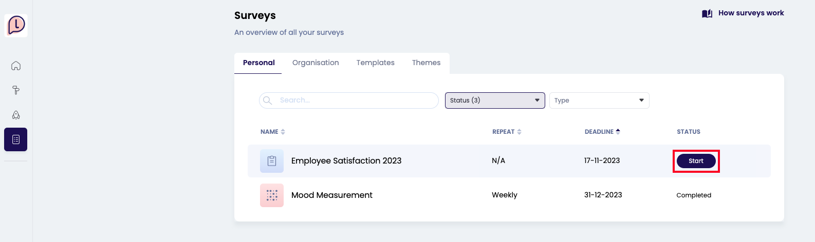 Surveys can also be found on the Surveys page on the left side of the menu. From here, you can also start the survey, edit your answers while the survey is active, and view your results benchmarked against the organisations results.