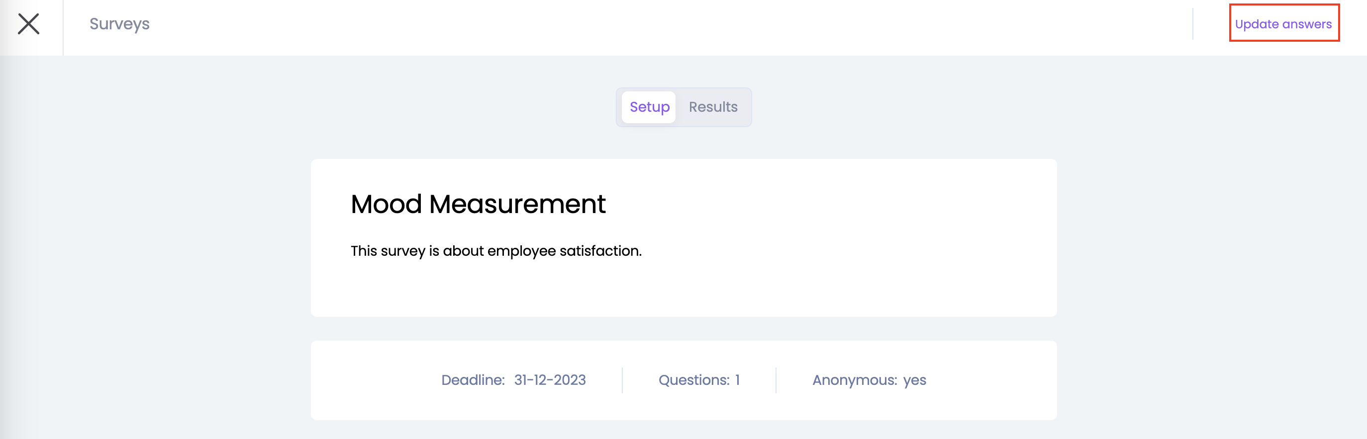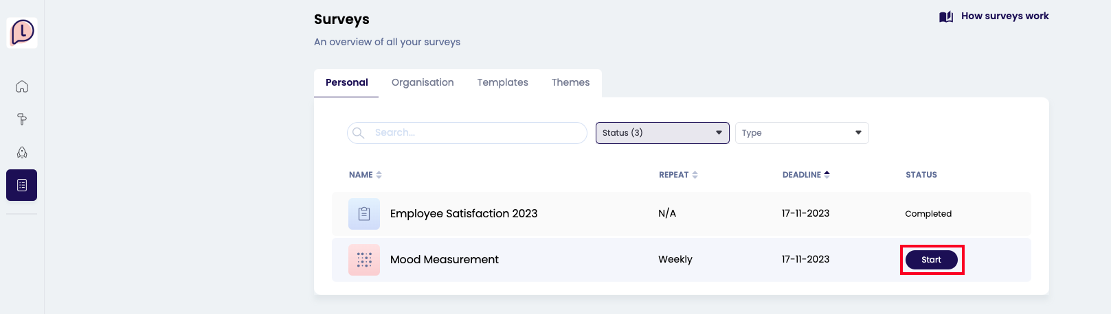 When you are invited to a Pulse survey, you will find it on the Surveys page. Go to the Pulse survey and click 'Start'.