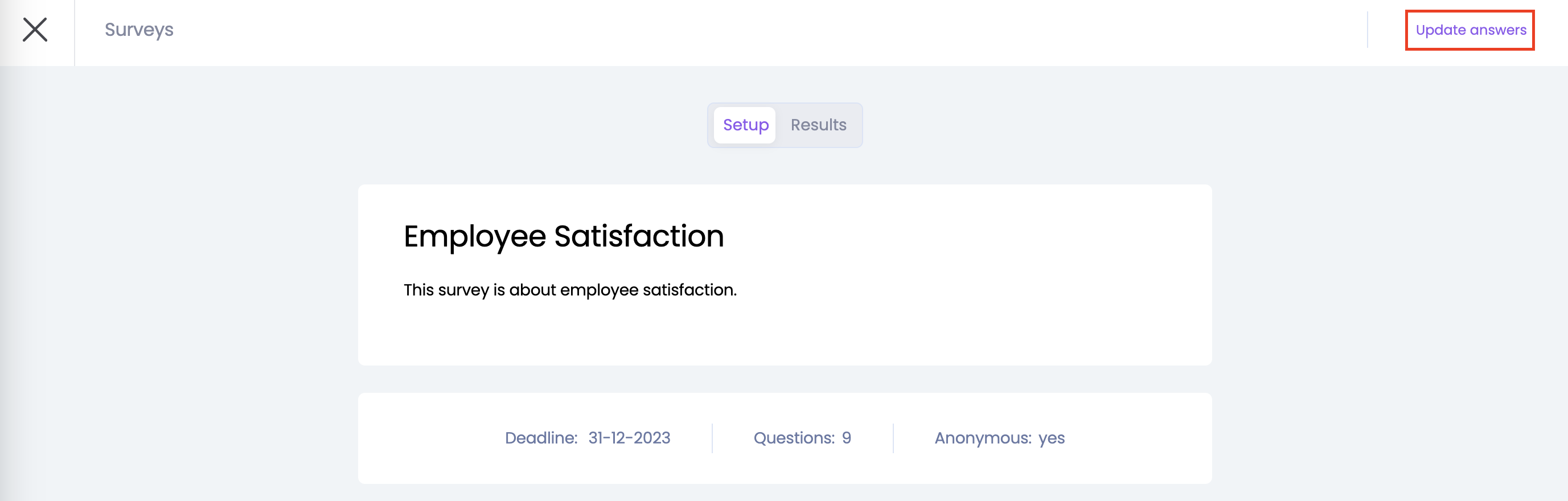 Once you have answered all survey questions, the survey status for you will also change to 'Completed'. You will still be able to edit your answers until the survey ends. After that, you will no longer be able to edit your answers.