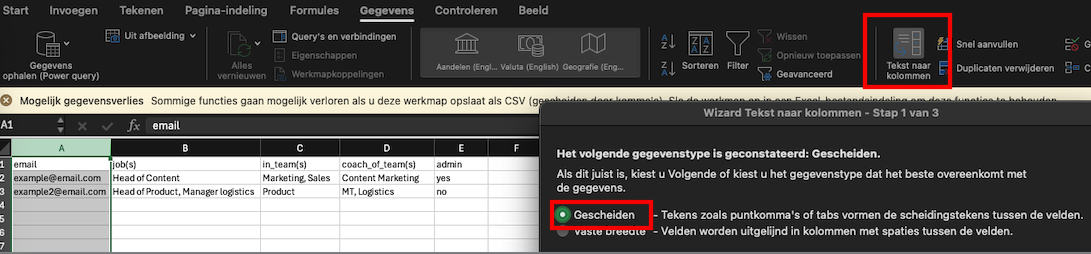 • When someone needs to be linked to multiple job profiles and/or to multiple teams, you fill this information within the same cell with a comma in between each time. See the download file for examples.