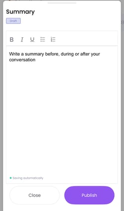 Everything you write is automatically saved as a draft. This means the attendee(s) cannot see it yet. If you want to make your summary visible in the report, click ‘Publish’.