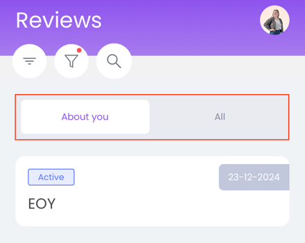 If you go via the menu to Reviews, you will arrive at an overview page. Under the tab ‘About you’ you can find all your evaluations from the past and the upcoming ones. Under the ‘All’ tab you will find all conversations in which you participated as a guest, e.g. when you are also a manager.