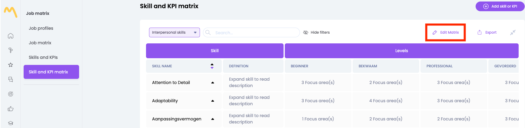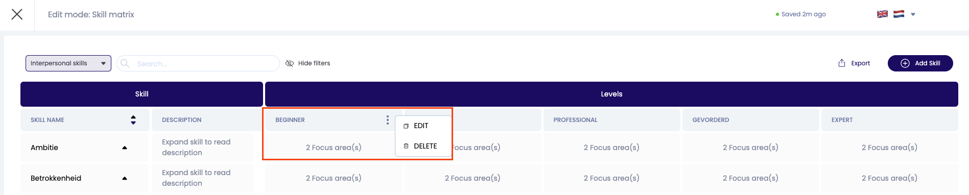 From the Learned skill templates that are in our database, you are given 2 focus areas per skill level. This ensures that when you import a skill template to your own skill matrix, it is automatically filled with these focus areas. You can of course adjust these focus areas per skill or add additional focus areas. To do so, go back to the Edit mode of the skill matrix. Open the skill where you want to make an adjustment. Then move your mouse over the focus area, 3 dots will appear. Here you can modify the existing focus area.