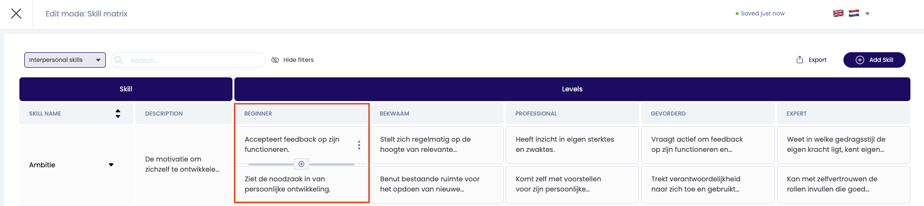 It is also possible to add additional levels to the skill category. To do this, move your mouse between two levels. A + sign will appear to add an extra level to this skill category. The extra level is only visible in the corresponding category. All skills you subsequently create, or import from the Learned templates, can be entered at the new number of levels.