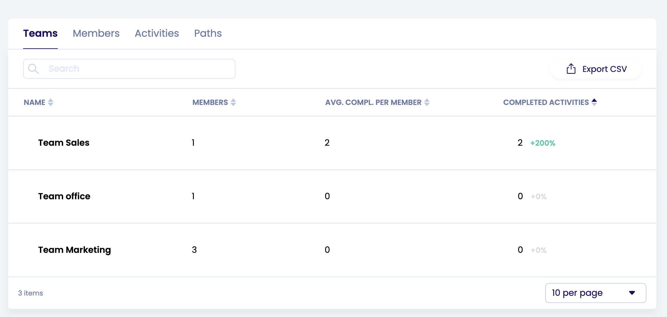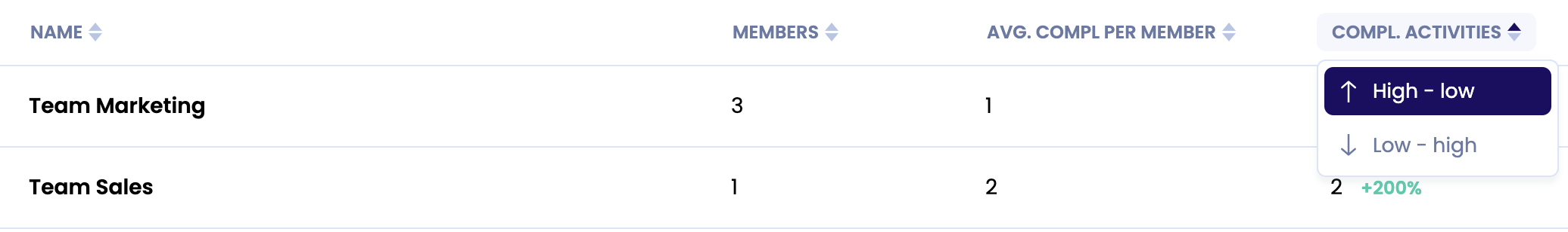 For each team, you can see how many members are on the team, the average completed activities per member of the team, and how many activities have been completed in this team.
