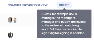 Guests are invited to the review without providing input. Examples include an HR manager, the manager's manager or a buddy. It is important for them to be present during the actual conversation, but they do not need to prepare for the conversation and therefore do not need to provide the employee with input and feedback. A guest will have to sign the report if digital signing is enabled. In addition, it is also the guest’s responsibility to schedule a date and time for the conversation when this option is activated during the creation of the review cycle.
