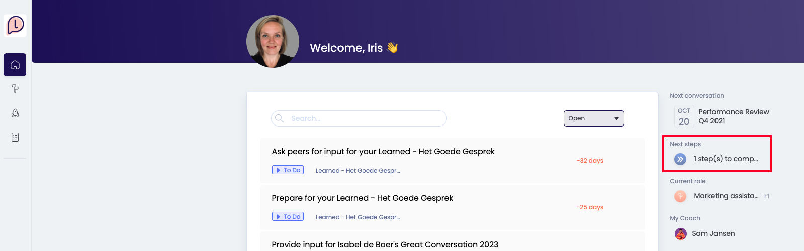 When you create a next step in either your development conversation or your 1:1, you can easily find your next steps on your homepage.