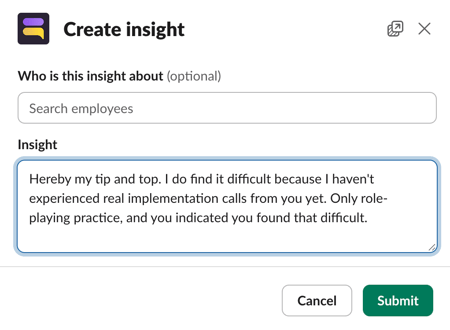 Of gebruiker klikt op het menu (⋯) naast een Slack-bericht en kiest “Create insight”. Ook hierbij opent een formulier waarmee het bericht kan worden doorgestuurd naar het platform, inclusief aanvullende informatie zoals over wie het inzicht gaat. Na bevestiging wordt de feedback doorgestuurd naar het Learned platform, waar het wordt opgeslagen in het profiel van de gebruiker.