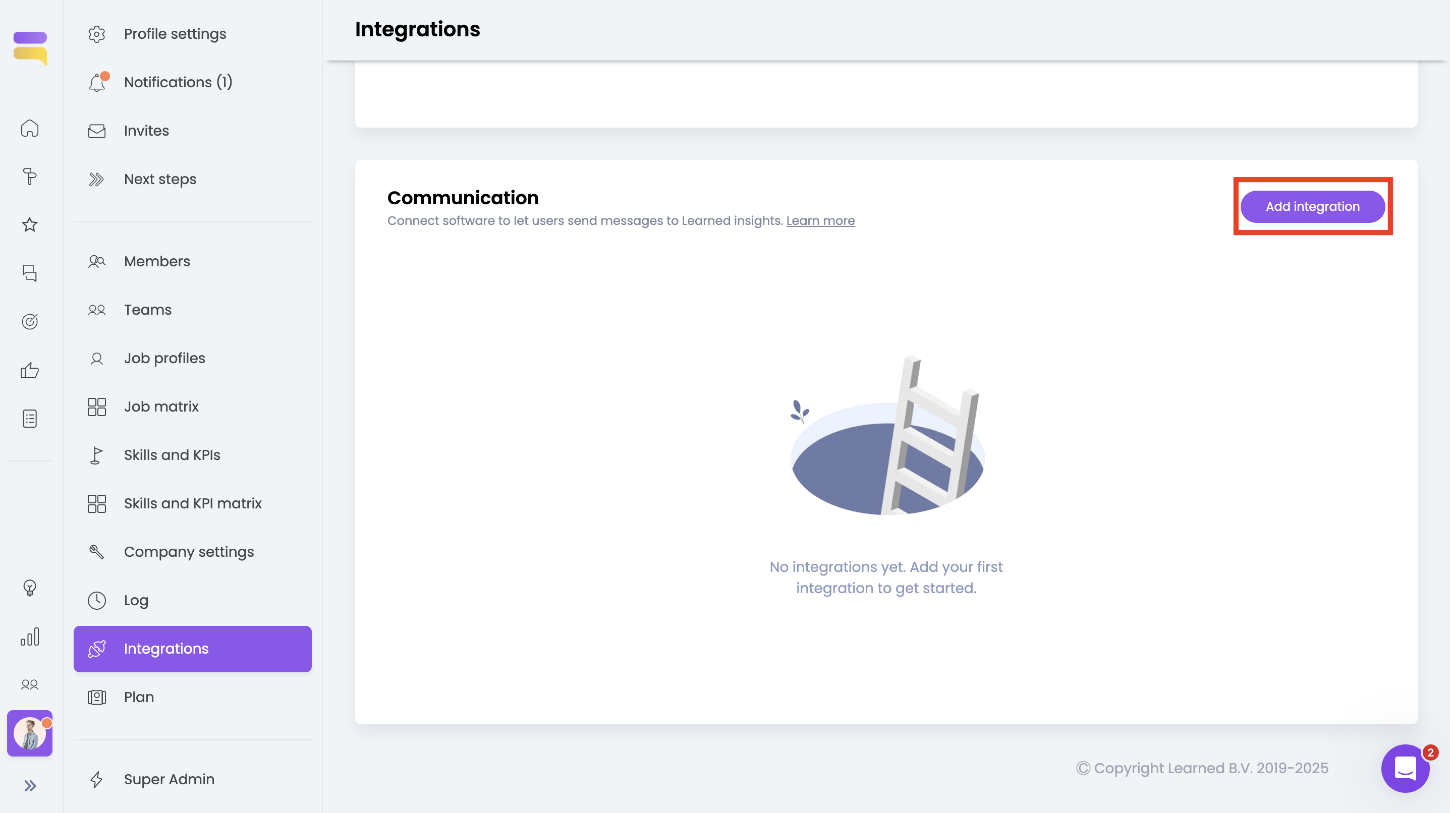 Om de integratie met Slack tot stand te brengen en goed te keuren navigeert de Admin in Learned naar de Integraties pagina. Hier vind je de communicatieintegraties en mogelijke HRIS integraties. Klik op 'Voeg integratie toe' en kies voor Slack.