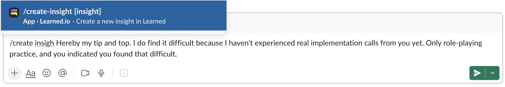 Eenmaal de app toegevoegd op Slack, kan je aan de slag met het aanmaken van Inzichten en deze doorsturen naar Learned.
