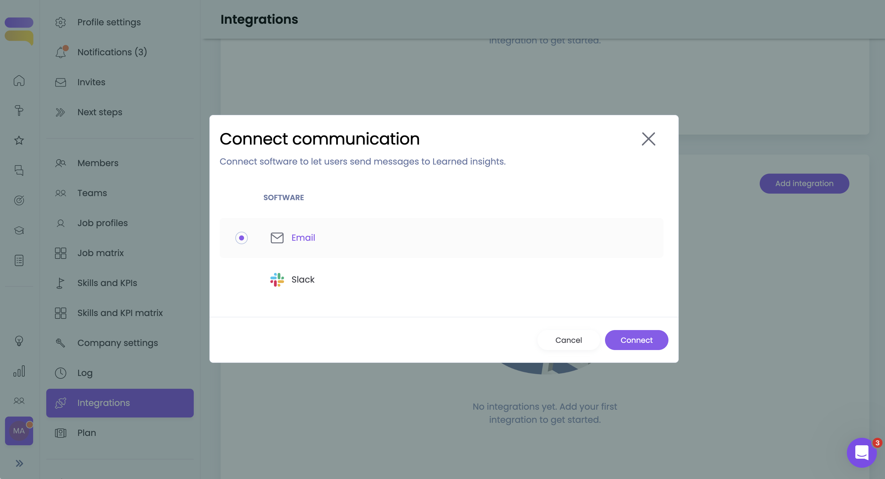 Om de integratie met de e-mail tot stand te brengen en goed te keuren navigeert de Admin in Learned naar de Integraties pagina. Hier vind je de communicatieintegraties en mogelijke HRIS integraties. Klik op 'Voeg integratie toe' en kies voor e-mail.