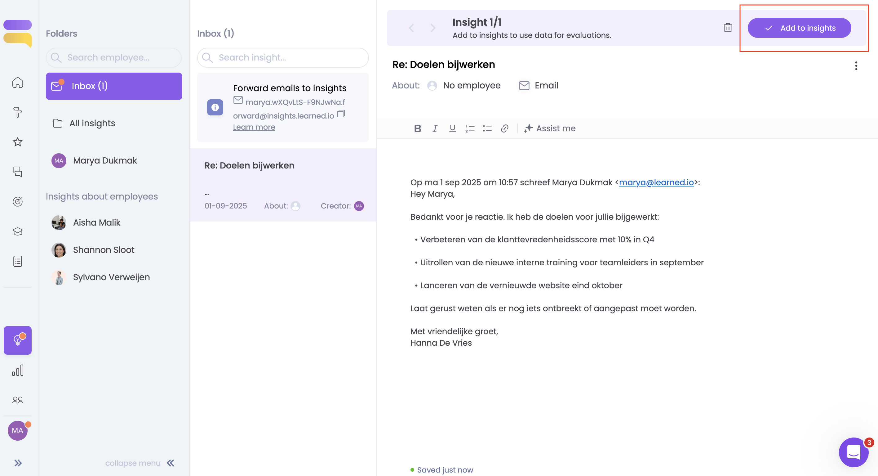 Learned haalt automatisch de belangrijkste gegevens uit de e-mail zoals: het onderwerp, de deelnemers en verzenddatum. Indien van toepassing wordt het doorgestuurde inzicht automatisch gekoppeld aan medewerkers over wie het gaat, op basis van herkenning van e-mailadressen.