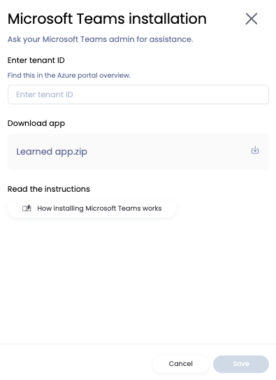 ❗️: Download na het invoeren van de Tenant ID gelijk het .zip bestand van de Learned app. Deze heb je later in het proces weer nodig.