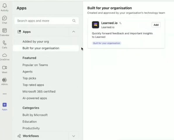 Wanneer je ingelogd bent in Microsoft Teams, klik je linksonderin op 'Apps' > gebouwd voor jouw organisatie en klik op 'Toevoegen' achter Learned.