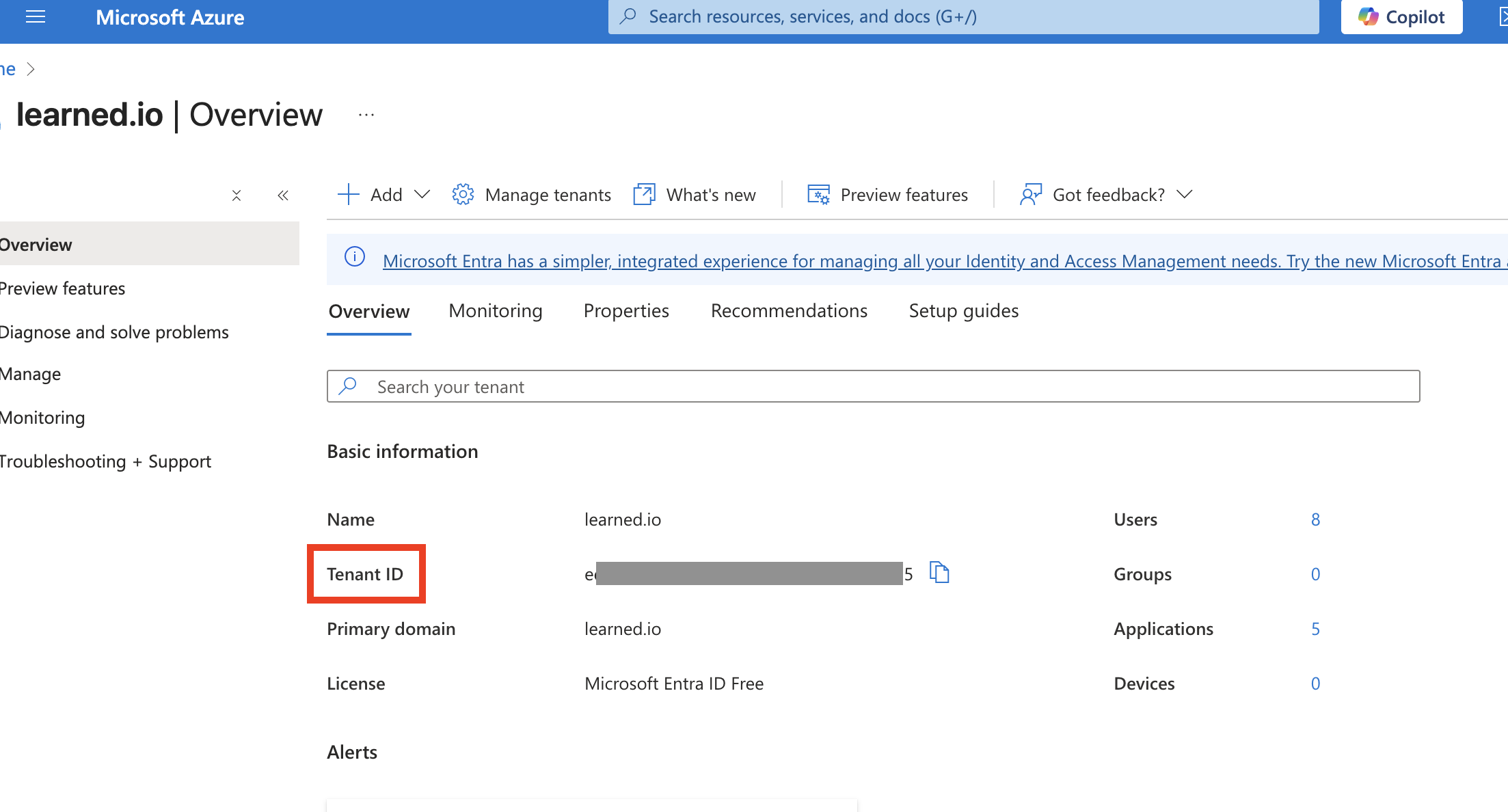 Om het ID te vinden navigeer je in de Azure omgeving naar 'Entra ID'.