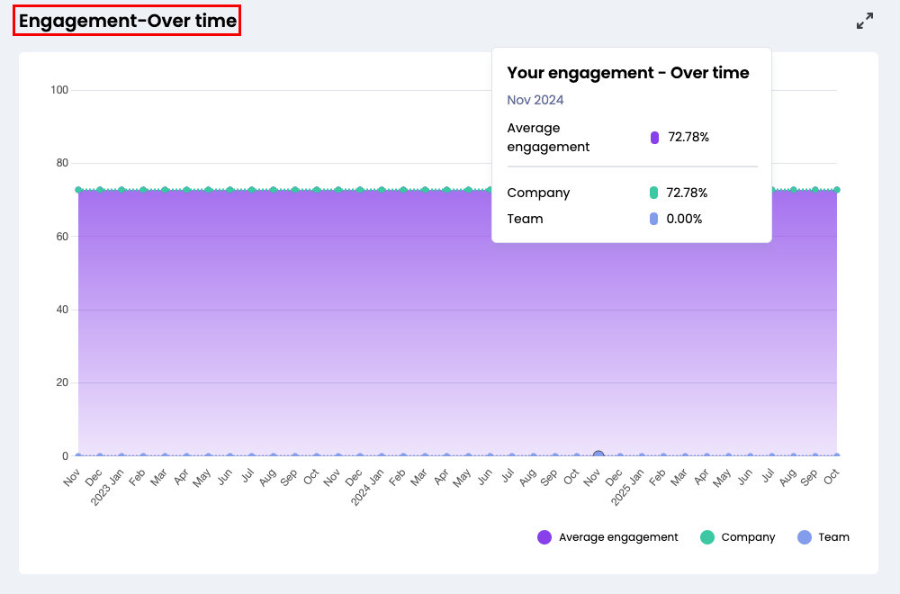• Over tijd: Hier zie je een tijdlijn met jouw Engagement score. Wanneer je meerdere surveys hebt ingevuld, zul je hier je score zien na verloop van tijd. Hier zie je dus in één oogopslag jouw score na verloop van tijd. Je kunt jouw score hier ook vergelijken met de score van jouw team en de hele organisatie. Deze scores verschijnen met een stippellijn in het rapport.