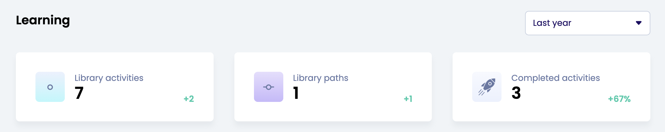 Om de Learning rapportage te bekijken ga je linksonder naar Rapportages - Learning rapportage. Vanuit hier krijg je een dashboard te zien waar je in één oogopslag hoeveel activiteiten er zijn aangemaakt, hoeveel leerpaden er zijn gecreëerd en hoeveel activiteiten er zijn afgerond. Je hebt de mogelijkheid om de periode aan te passen middels de dropdown rechtsboven.