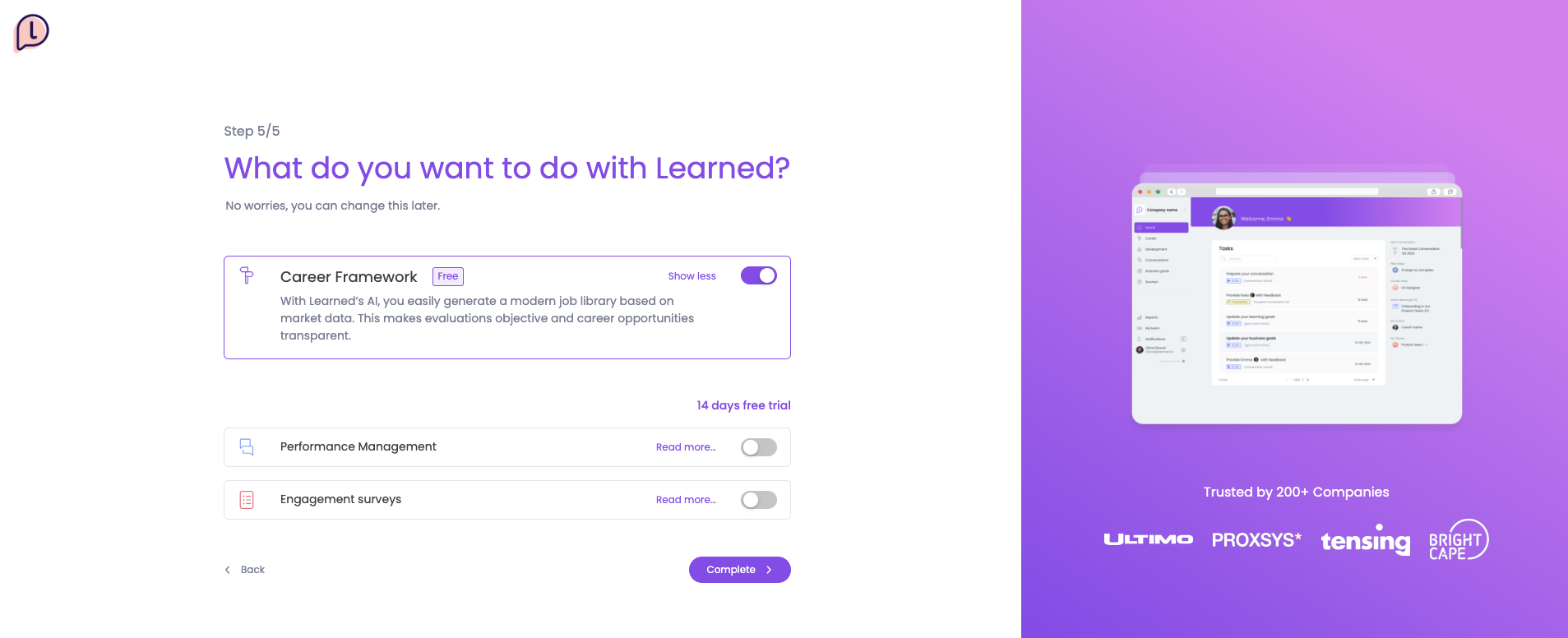 In de laatste stap selecteer je met welke producten van Learned je wilt gaan starten. Wil je meer informatie over de verschillende producten? Klik dan hier.