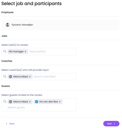 Daarna selecteer je de gasten die bij het fysieke gesprek, om het evaluatierapport te bespreken, aanwezig zal zijn. Over het algemeen is jouw coach die input geeft ook een gast. Daarnaast kunnen bijvoorbeeld een HR-manager, de manager van de manager of een buddy ook als gast worden toegevoegd. Die worden uitgenodigd voor de evaluatie zonder input te geven. Maar ze moeten wel ondertekenen als digitaal ondertekenen is ingeschakeld. Je kunt deze gasten later nog bijwerken.