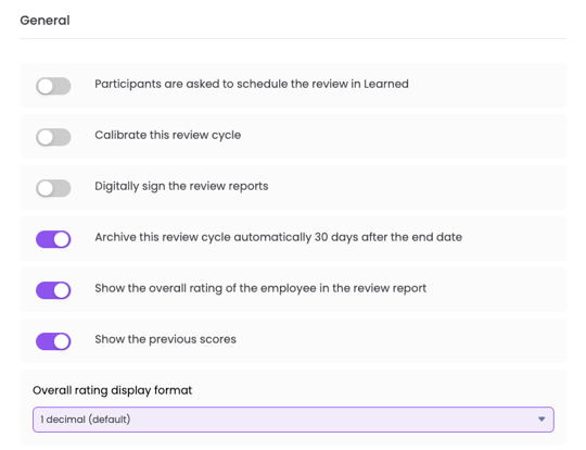 Als deze optie is ingeschakeld, kun je er ook voor kiezen om de totale beoordeling van de gewogen thema’s en je vorige scores in het rapport te tonen, weergegeven als decimalen of labels.