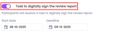 ❗️Let op: Je kunt alleen een start- en einddatum voor het digitaal ondertekenen van een evaluatie instellen wanneer dit in 'Algemene instellingen' bij het aanmaken van de evaluatiecyclus is ingesteld.