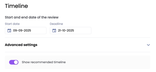 Naast het bepalen van de startdatum en deadline voor het voorbereiden van de evaluatie door medewerker, manager en eventueel collega's, kun je bij de tijdlijn ook een startdatum en deadline voor de volgende taken instellen: