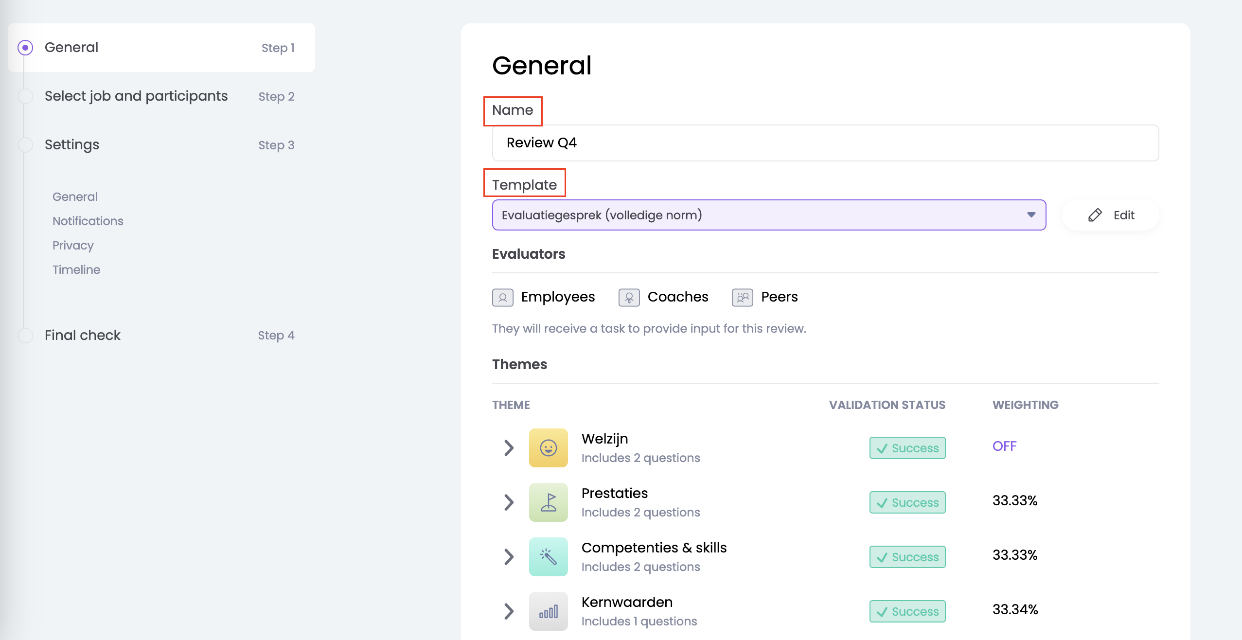 Bij het selecteren van een template wordt in het scherm een overzicht weergegeven van welke evalueerders zich moeten voorbereiden en welke thema's in het template zijn opgenomen, inclusief een mogelijke weging.