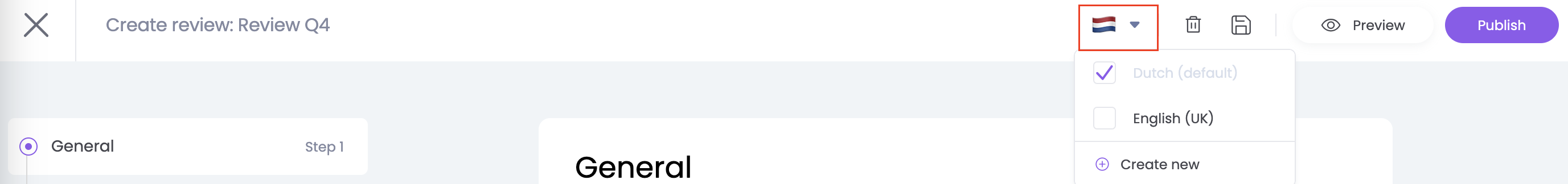 Bepaal rechtsboven op de pagina welke vertalingen van het template je wilt gebruiken voor de evaluaties. In het geval dat jouw coach of peer een andere voorkeurstaal heeft ingesteld, zal de coach het evaluatieformulier in gekozen voorkeurstaal te zien krijgen.