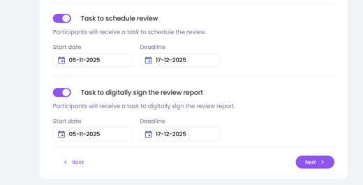 Bij stap 4: Tijdlijn kun je de deadlines per taak aanpassen. Daarnaast kun je het uitnodigingsbericht bewerken. Wanneer je de opties inschakelt waarmee deelnemers hun review kunnen inplannen of ondertekenen, kun je daarvoor ook een deadline instellen.